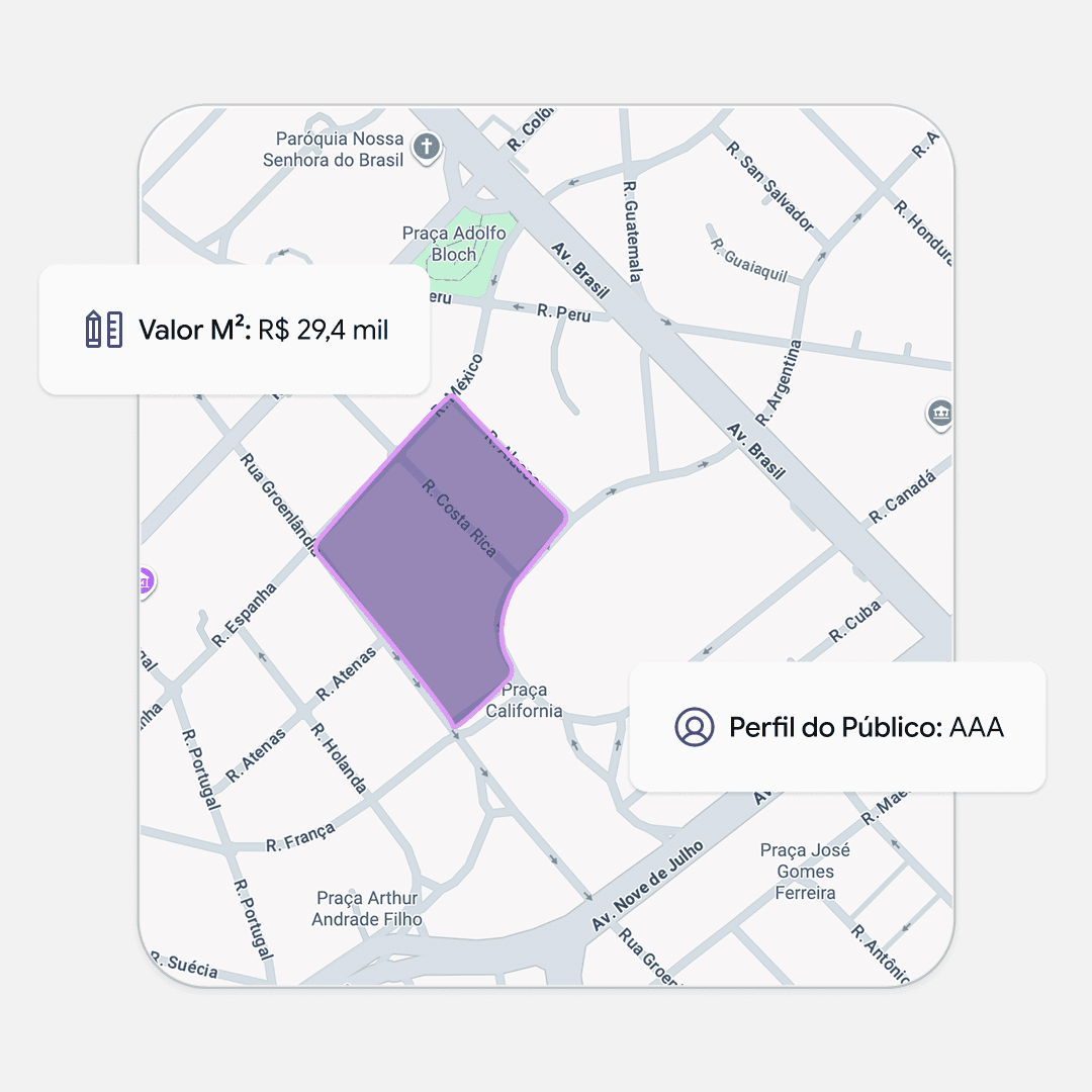 Decidir onde abrir uma nova unidade, instalar infraestrutura ou adquirir terrenos exige cruzar dezenas de fontes. Perfil da região, crescimento demográfico, dinâmica de ocupação, restrições construtivas. Hoje isso é feito manualmente, com informação incompleta e quase sempre descentralizado. Com a Dataland, isso muda. Os dados não ficam apenas acessíveis, eles são consolidados, estruturados e prontos para análise. Consulte potencial construtivo, restrições, perfil social e econômico, ocupação futura e dinâmica da região em minutos.